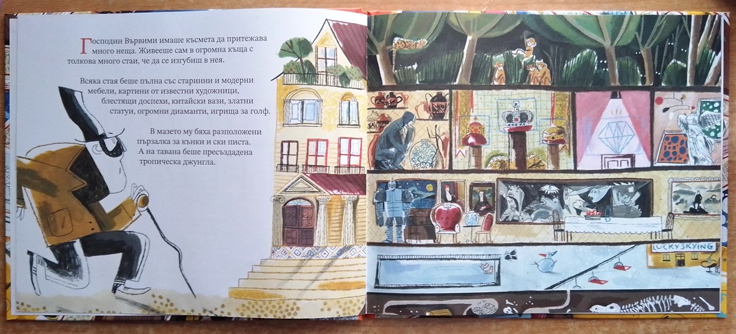 Аличе Копини е съвсем млада (завършила през 2015 г.) и доста талантлива илюстраторка. Работата ѝ с гваш, пастели и моливи е много динамична – с усет за движение, поза, жест, почти като стопкадри от анимационен филм. Характерният герой, разбира се, също помага за това усещане. За родителя, който чете книгата на детето си, има скрити малки подаръци – например да открива кои точно прочути картини и статуи красят дома на г-н Вървими. Тази стилистика в момента явно се преподава в добрите художествени академии в Европа, тъй като подобен стил се среща и в други детски книги. Тук обаче е чудесно изпълнен, сам по себе си е очарователен, а у нас почти не се среща, така че, ако имате близко дете, горещо препоръчвам да му доставите удоволствие с тази книга.