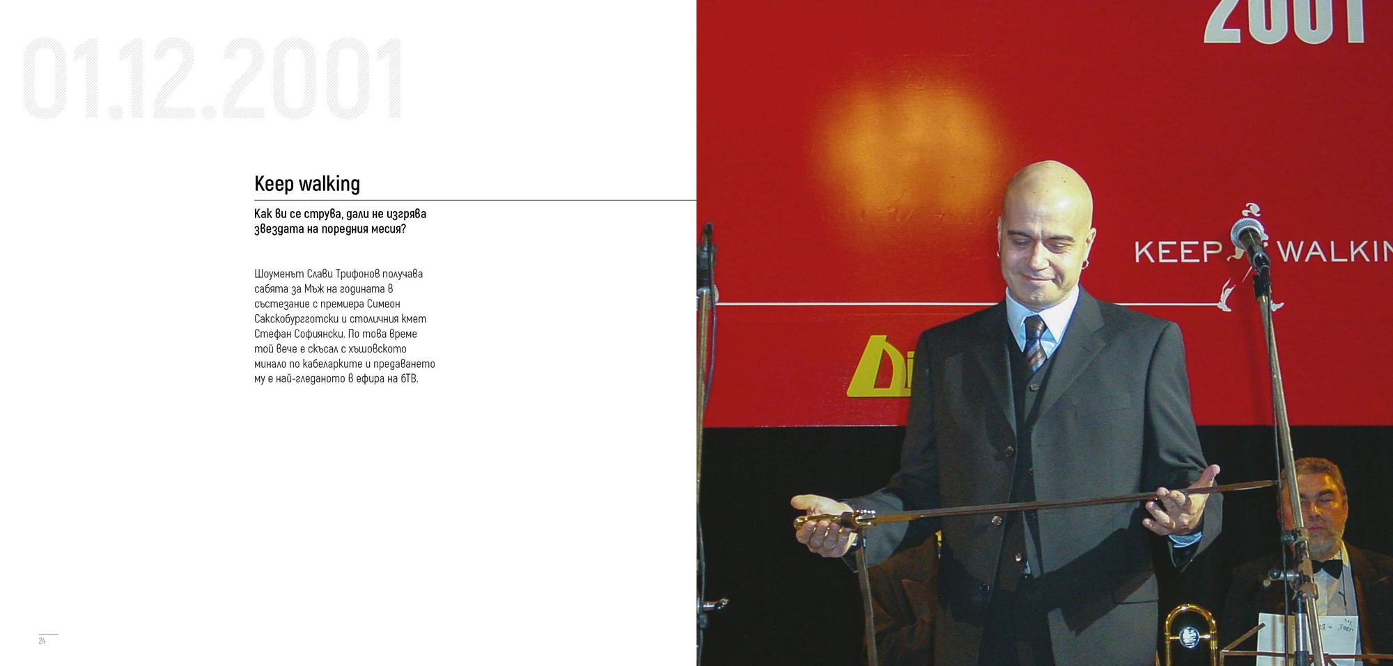 Една снимка обаче не ми излиза от главата. Годината е 2001-ва, първи декември. Слави Трифонов, току-що избран за Мъж на годината, позира със сабята си – и я гледа любовно…