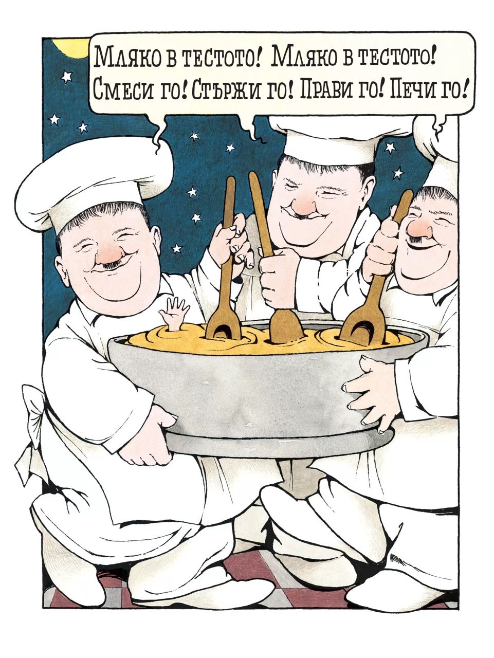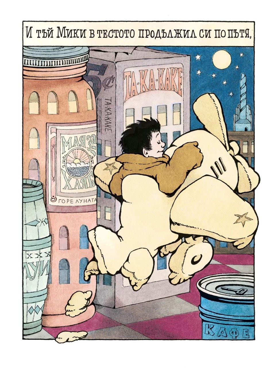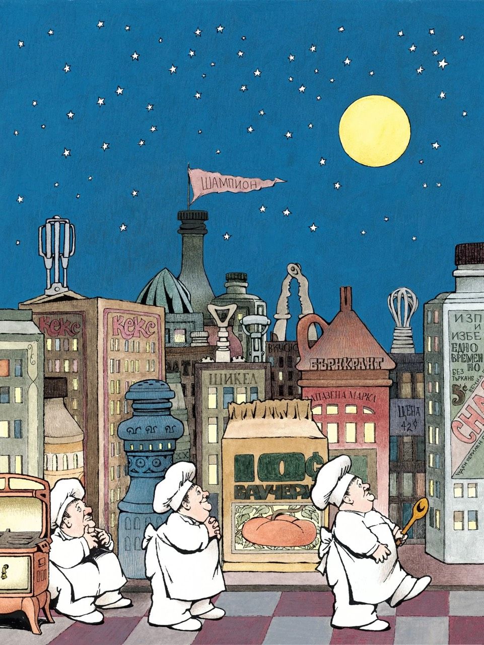 Всъщност внушителната му ерудиция личи най-вече във визуалната част на работата му – в скрити препратки, които не се натрапват на читателя, но са там. При „В нощната кухня“ може да забележите например, че сградите са всъщност кутии с продукти. Че всеки от тримата пекари поразително прилича на Оливър Харди. Че градският пейзаж е от 30-те, дори стилистиката напомня тогавашните реклами, а книгата е от 70-те. Какво значи това? Можем ли да преведем сюжета и рисунките на езика на „поуката“, на внятния разказ? Не – и не бива. Децата не се страхуват от безсмислицата, казва Сендак в същото интервю. Това е възрастен страх. Впрочем той определя „В нощната кухня“ като книга за деца на 2–3 години и тя със сигурност може да бъде четена така – особено в моментите, когато пекарите вземат Мики за мляко и го замесват в тестото. Може да бъде четена на глас с гушкане и мачкане – впрочем ние също казваме на децата си, че са „сладкиши“, нали? И това не е страшно, мило е.