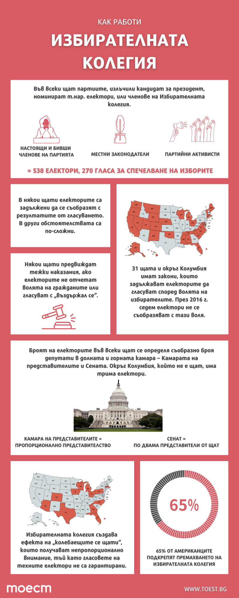 Ако от всичко това ви е заболяла глава, не сте единствени. Освен класическото разделение на властите, цялата система на управление на САЩ е изградена от подобни микропроверки и баланси, които понякога работят, а понякога отнемат повече свободи, отколкото дават, в добрите случаи – временно. Компромисът за Избирателната колегия е само един от многото, заложени още в основите на държавата. Тези компромиси между често взаимно изключващи се позиции осигуряват така необходимия баланс, в който може да вирее някаква свобода, включително и най-важната – да се променят вече установени механизми.