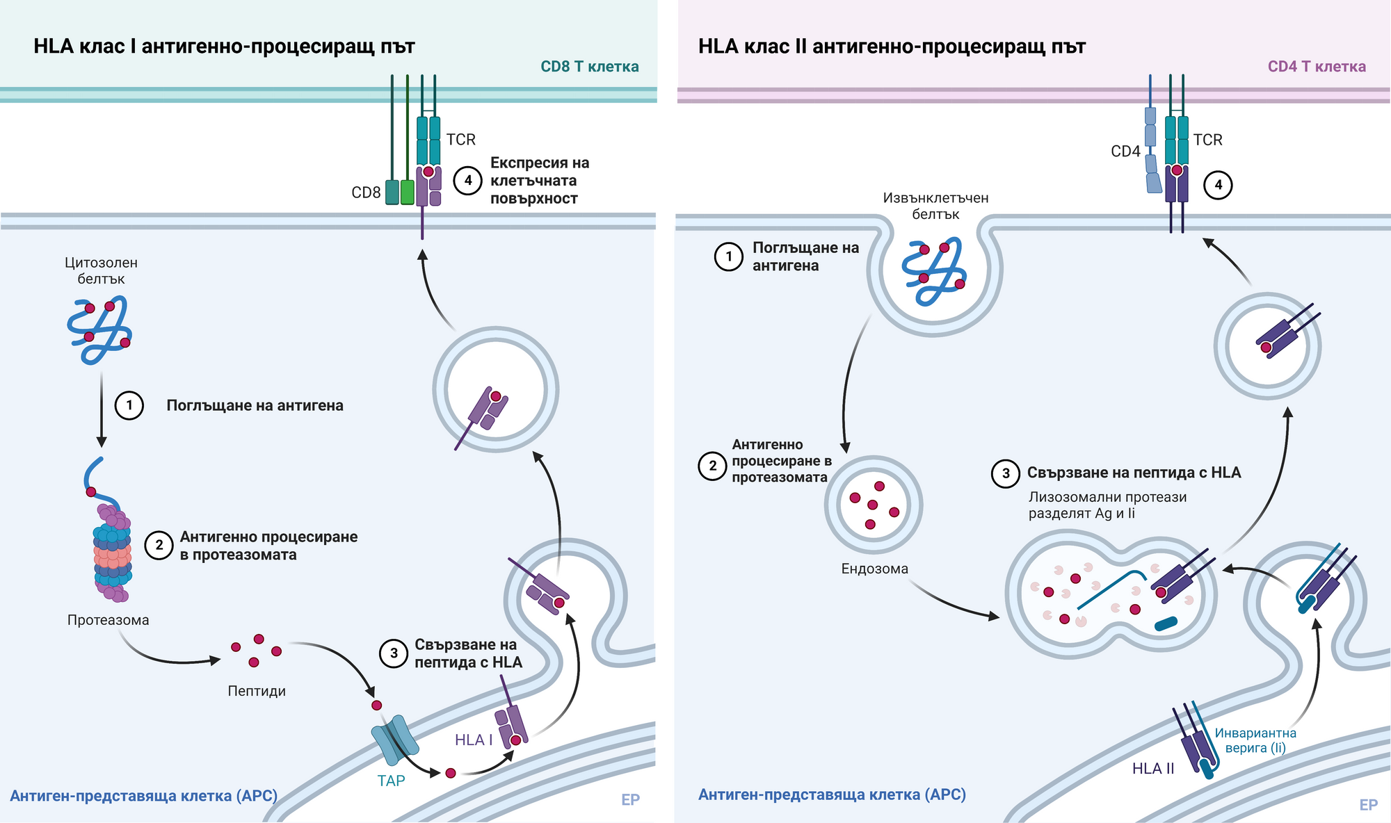 Най-прекият път към вътрешния свят на клетката е HLA системата (Human Leukocyte Antigens – човешки левкоцитни антигени). Тя е известна и като главен комплекс за тъканна съвместимост при човека. Състои се от над 200 гена, които изграждат „прозореца“ на клетката. Тези гени носят информация за белтъци, наречени гликопротеини, намиращи се на повърхността на клетките. За тях се закачват определени пептиди (части от белтъци), произхождащи от клетката.