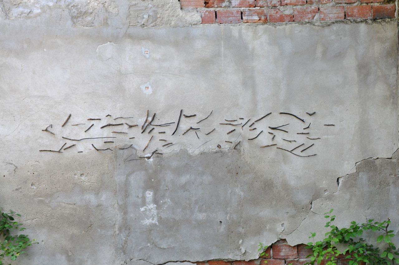В края на разходката стигаме до почти невидима лента от шума, широка към две педи и отлепяща се съвсем леко от земята, като тръснат във вятъра плат. Работата е на Катерина Милушева, друг основен член на „Дупини“ . Също като други нейни творби, тя издава подчертан афинитет към незабележимото, към пресечната точка на лендарта и минимализма, към изтриваемото. Туркинята Севил Сайгъ също се интересува от изтрития смисъл на думите: тук е прикрепила върху стара стена клечици, които напомнят за изпадал надпис. Постчовешкото на думите.