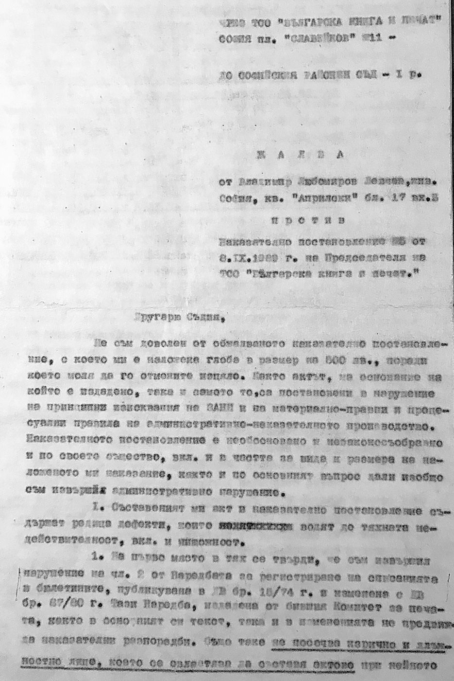В тази сложна ситуация се намира адвокат от по-възрастното поколение – Васил Начков, който съветва двамата издатели да оспорват глобата в съда. Един от аргументите на адвоката е, че двамата са изготвили не списание, а само макет за него със статут на ръкопис. По съвет на адвоката Левчев и Сугарев дори подават молби да се регистрират двете им издания, но получават очаквания отказ. Делото пък се гледа чак след падането на Тодор Живков и представителят на държавната цензура дори не се явява в съда. После Караманчев издава книга със спомени, в която твърди, че спасил двамата издатели от преследване, като казал на адвоката си да не се яви в съдебната зала. Пропуснал е да отбележи само едно: вече е духал вятърът на промяната и е наближавал краят на цялото ТСО „Българска книга и печат“.