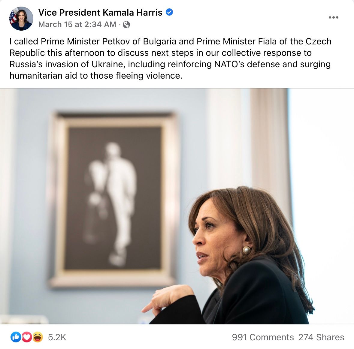 В тази „компания“ на държави, оказали скромна подкрепа на Украйна, се оказа и България. Но това не попречи на премиера Кирил Петков да каже, без да му мигне окото, че вицепрезидентката на САЩ Камала Харис му се обадила, за да му благодари за българската помощ за Украйна (думите са изречени на традиционната годишна среща на бизнеса с правителството, организирана от „Икономедиа“). В профила си във Facebook тя съобщи нещо различно от изявлението на Петков и идентичното правителствено прессъобщение.
