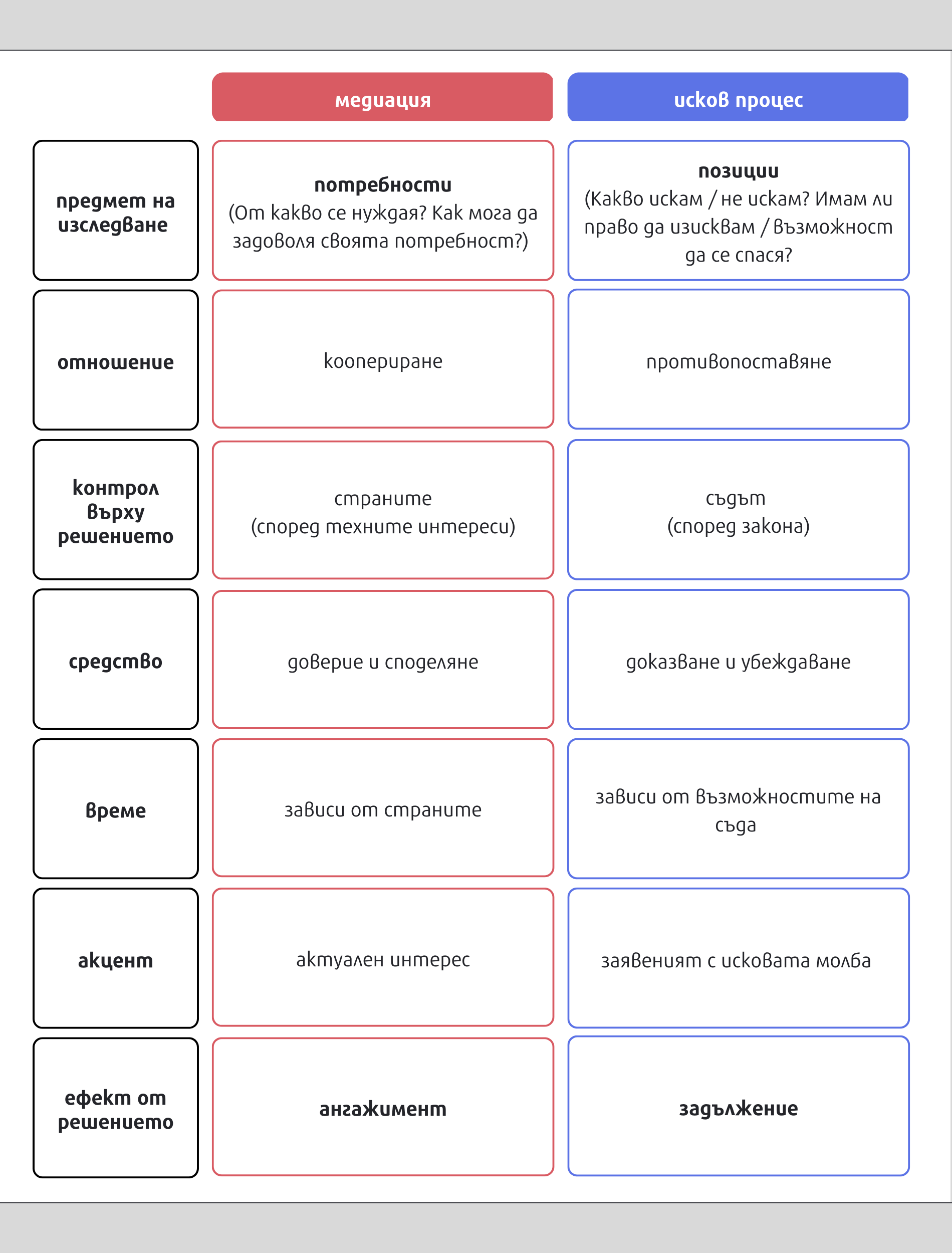 Процедурата по медиация е доброволна. Само от нас зависи дали, как и докога да участваме в нея.
