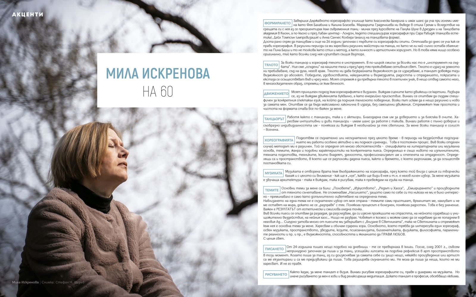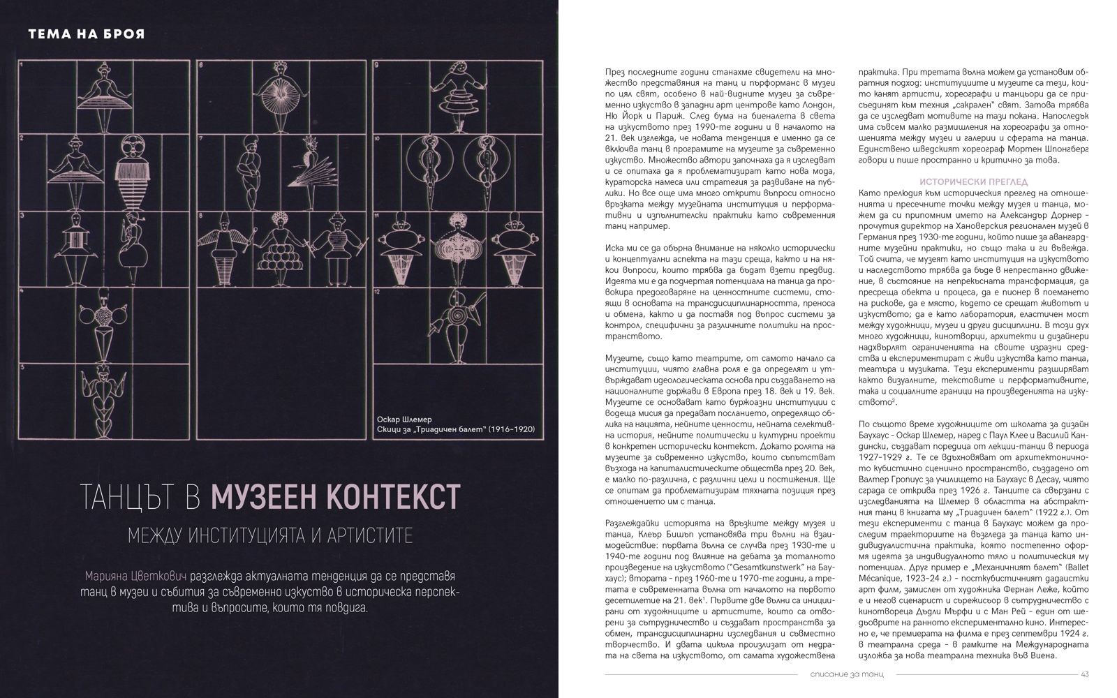 В едно специализирано издание, ориентирано към разнородна аудитория, т.нар. академично и журналистическо писане са с по-размити очертания. Не можем за основните си теми да не черпим от танцовите изследвания, но с амбицията да ги направим достъпни, за да се формира критична маса. Залагаме и на задълбоченото журналистическо писане в неговото разнообразие – интервюта, профили, проблемни статии и пр. То има по-информативен и публицистичен характер. Танцовата критика се захранва и от двата вида писане.