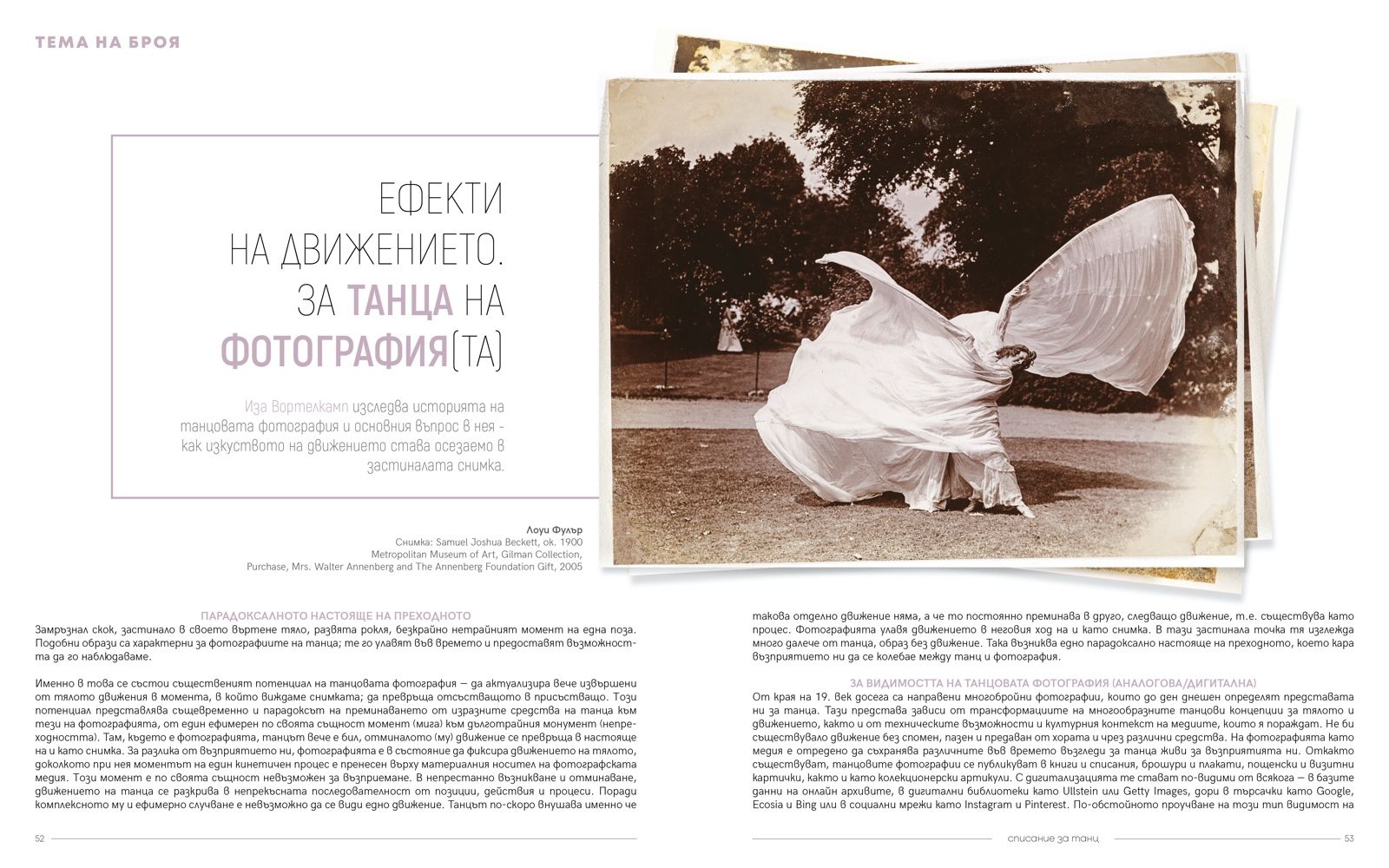Иска ми се да вярвам, че с рубриката „Антология“ подтикваме към колекционирането на списанието, като за първи път публикуваме внимателно подбрани текстове, христоматийни за (на този етап) западната история на танца. В „Традиции“ пък се стремим да хвърлим светлина върху слабо познати страни на миналото в българския танц.