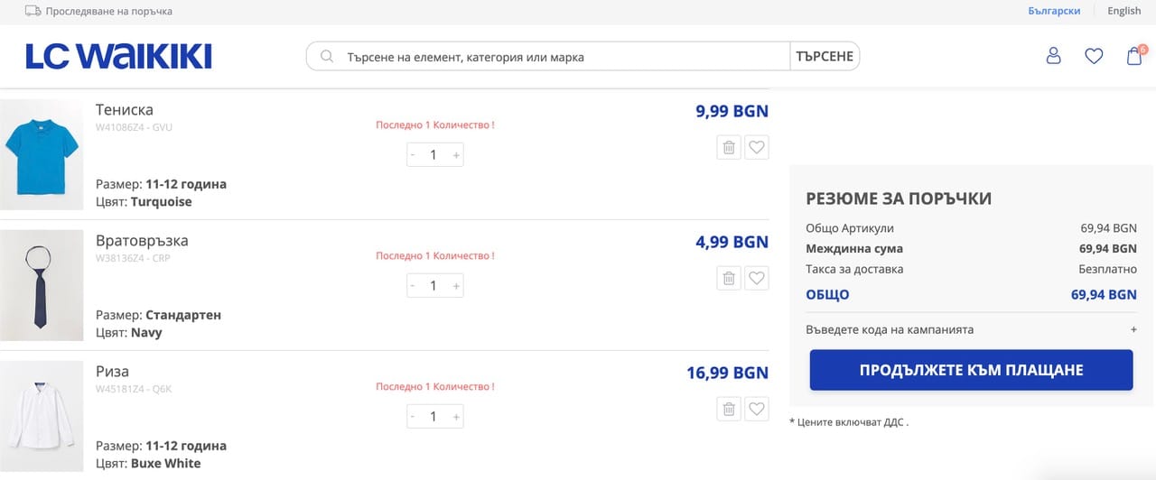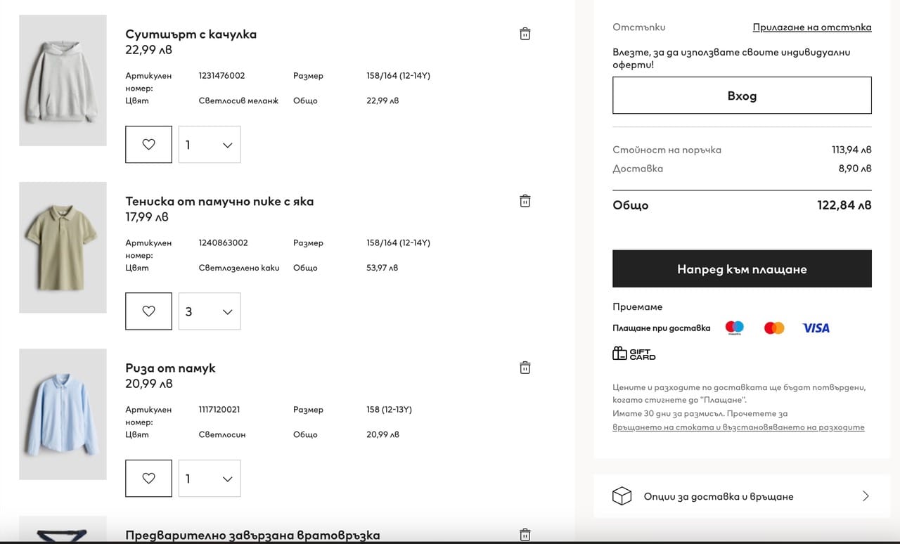 Това е абсолютен минимум, но динамиката на прането в домакинството ни го позволява, а и нямам желанието да купувам изкуствено оскъпено облекло. Откъде знам, че е изкуствено оскъпено ли? Ето един експеримент, който го доказва. Изключих от търсенето си най-евтините магазини за дрехи и натрупах същите продукти в кошниците на два онлайн магазина – LC Waikiki и H&M. За същото количество идентични като модели дрехи, направени от същите материи, в единия бих заплатила 69,94 лв., а в другия – 122,84 лв.