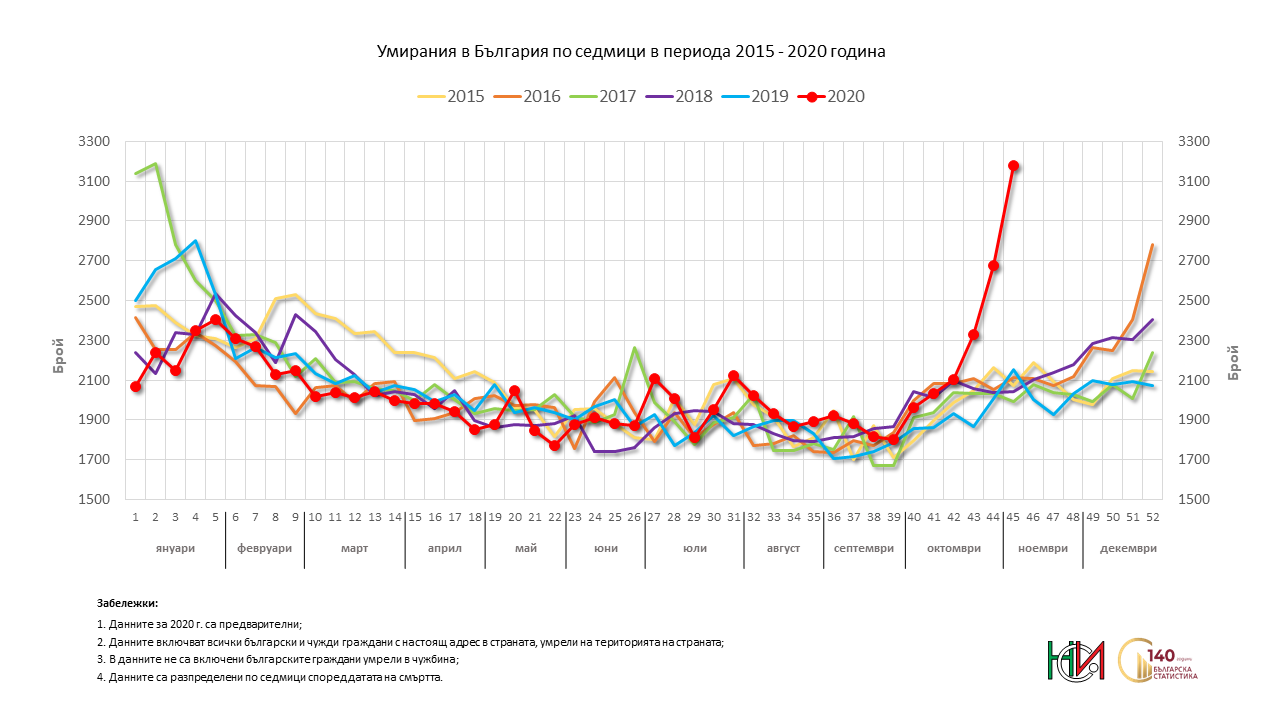 Заглавно изображение: Фрагмент от графика на НСИ относно прираста на починалите през 2020 г. спрямо средния брой на починалите в периода 2015–2019 г. в България. В синьо е отбелязано намалението спрямо предходните пет години, а в червено – увеличението.