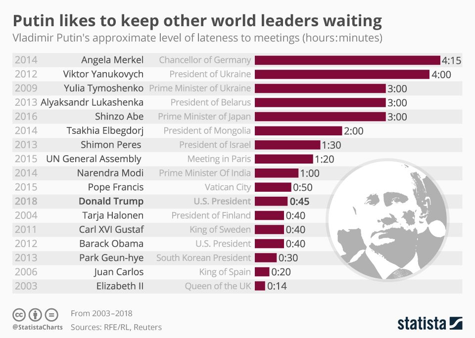 Друга любопитна инфографика отразява склонността на Путин да кара световните лидери да го чакат за среща. И макар да не му е подарил куче, Ердоган не присъства в тази статистика.
