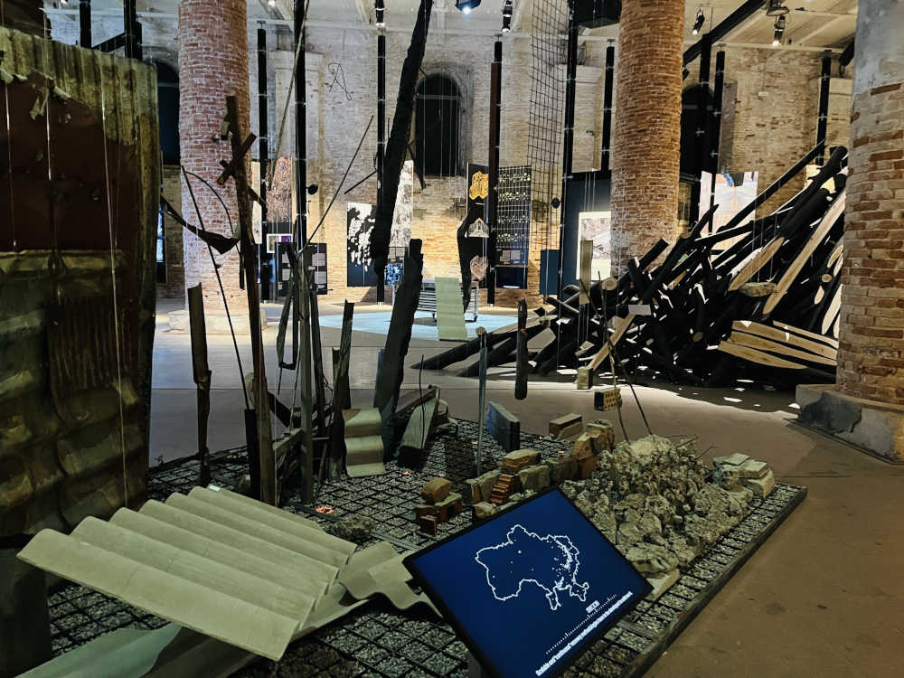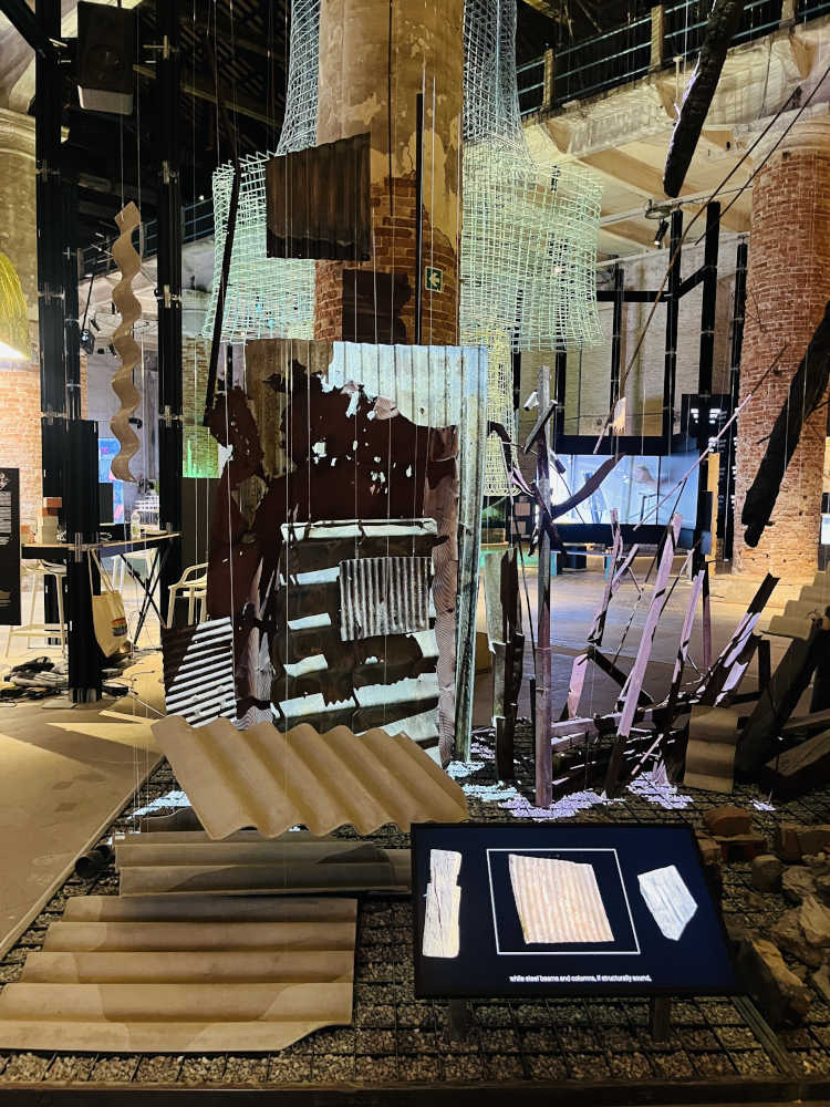 На пръв поглед инсталацията не е нищо особено. Тухли, камъни, парчета дърво, изолационни панели и всякакви строителни отпадъци висят на метални струни в своеобразна разпадната скулптура. Пред тях на екран се демонстрират възможностите на изкуствен интелект (ИИ) сред руините на сгради, унищожени от военен конфликт, да идентифицира чрез дрон материалите, които може да се преизползват за ново строителство, и да ги подрежда по степен на надеждност или замърсеност (установявайки например наличието на азбест в тях). Екипът е украински, а ИИ моделът е тестван на терена на украинския град Буча, разрушен през пролетта на 2022 г. Това е една от многото инсталации на тема екология, преизползване и климат на тазгодишното биенале.