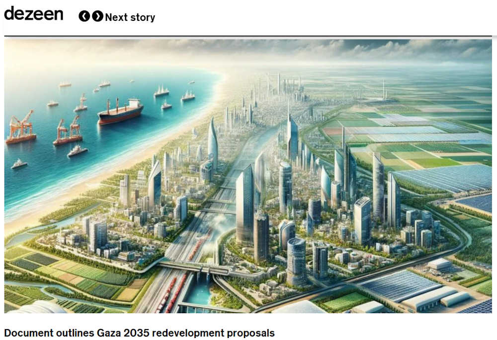 И май наистина си вярваше, че Газа може да стане „Ривиерата на Близкия изток“, макар че, както се разбра по-късно, клипът е бил създаден като политическа сатира от американския режисьор от еврейски произход Соло Авитал. Но публикуваният в израелската преса няколко месеца по-рано план Gaza 2035 за трансформация на територията във високотехнологична зона със стъклени небостъргачи и буйна зеленина изглежда съвсем убедителен.