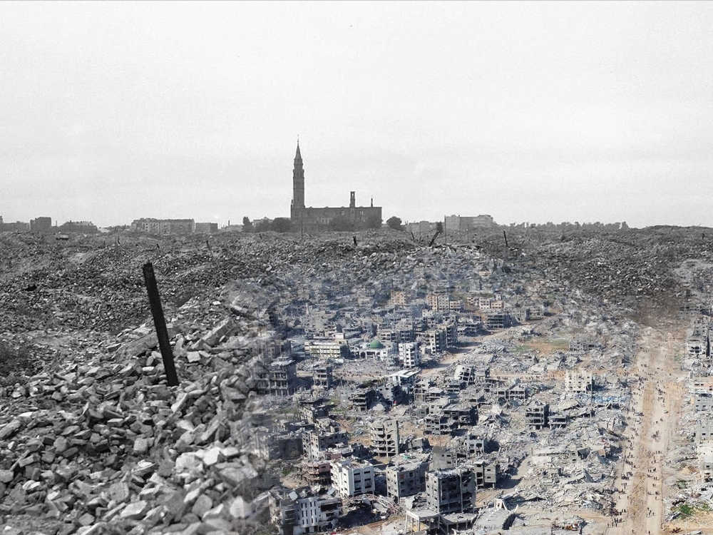 Първата е от Полша през 1943 г. Така изглежда Варшавското еврейско гето, създадено от нацистка Германия, след трагичния край на въстанието там през 1943 г. Кварталът е изравнен със земята, а от развалините насред пустошта стърчи само църквата „Свети Августин“ на улица „Новолипки“, която нацистите оставят като „арийска“ постройка. Това е един от най-известните пейзажи на урбицид (умишленото и пълно унищожение на застроена градска среда) в новата история на Европа.