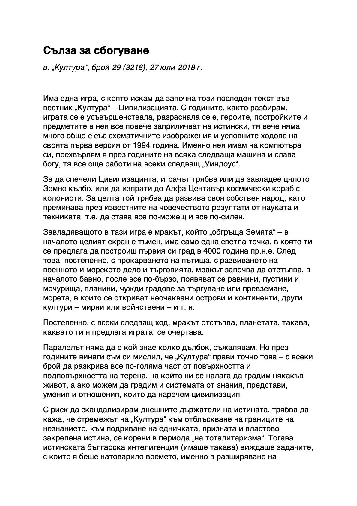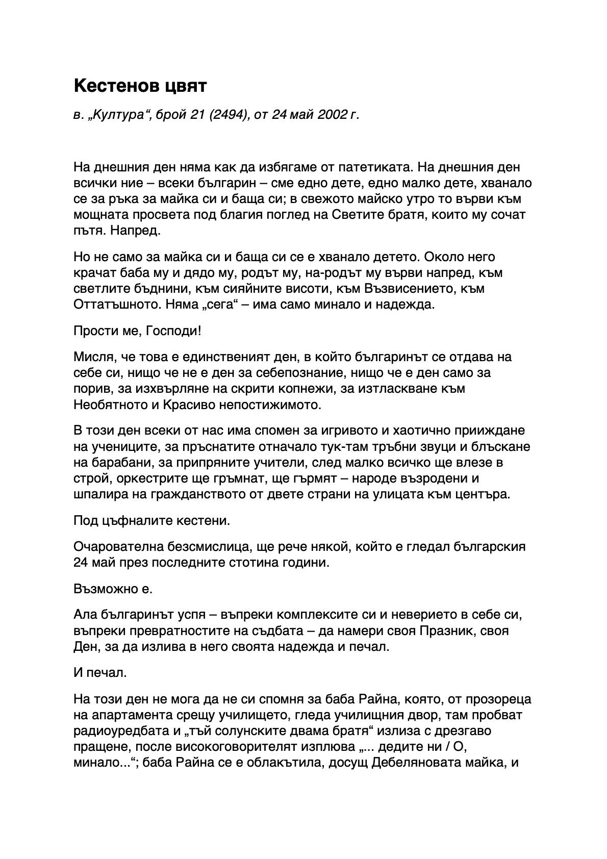 На раздяла публикуваме текстове на негови автори, колеги и приятели, както и две от емблематичните му статии: „Кестенов цвят“, публикувана във в. „Култура“, бр. 21 от 24 май 2002 г., и „Сълза за сбогуване“ в последния изобщо брой на вестника от 27 юли 2018 г.