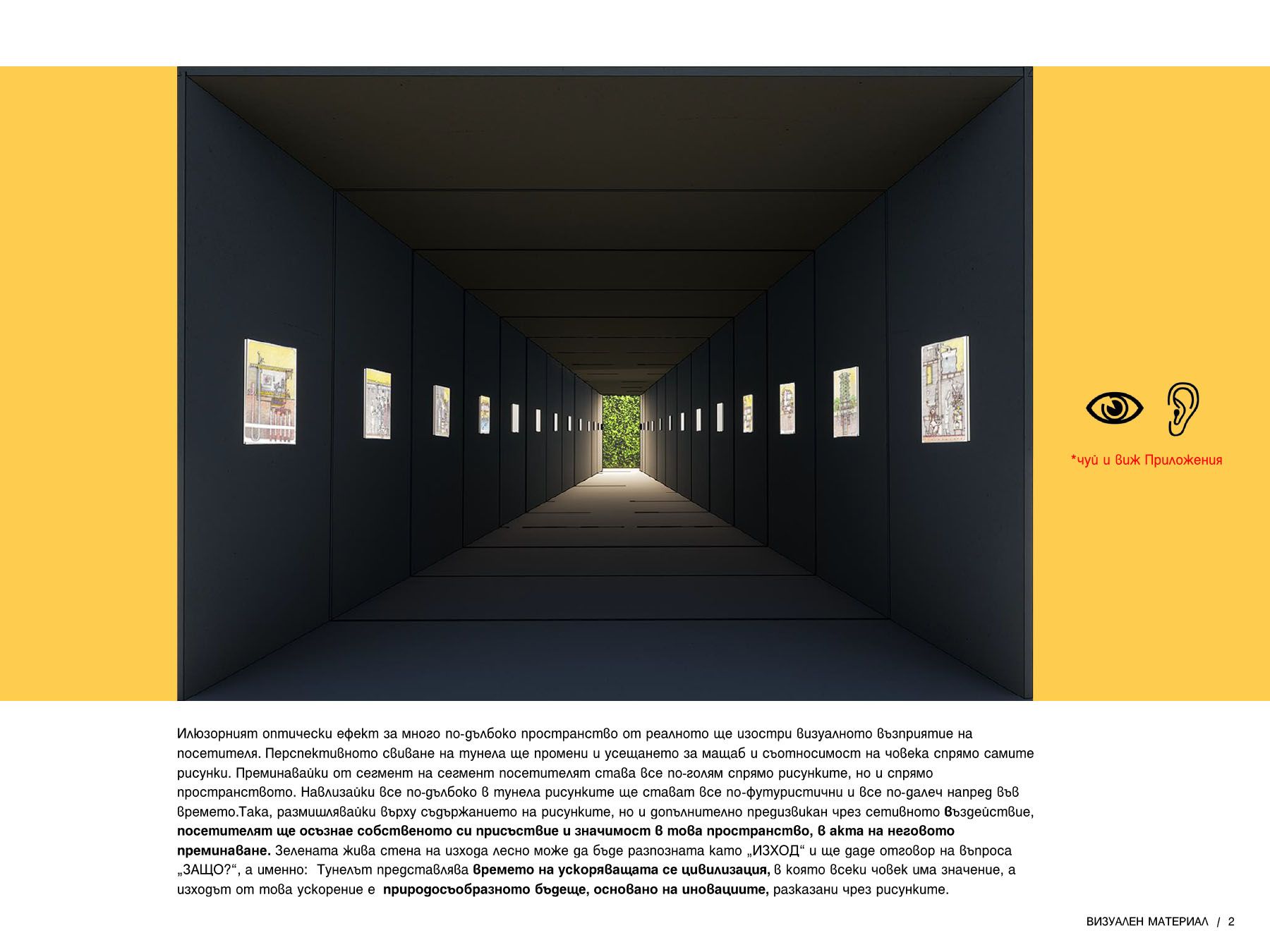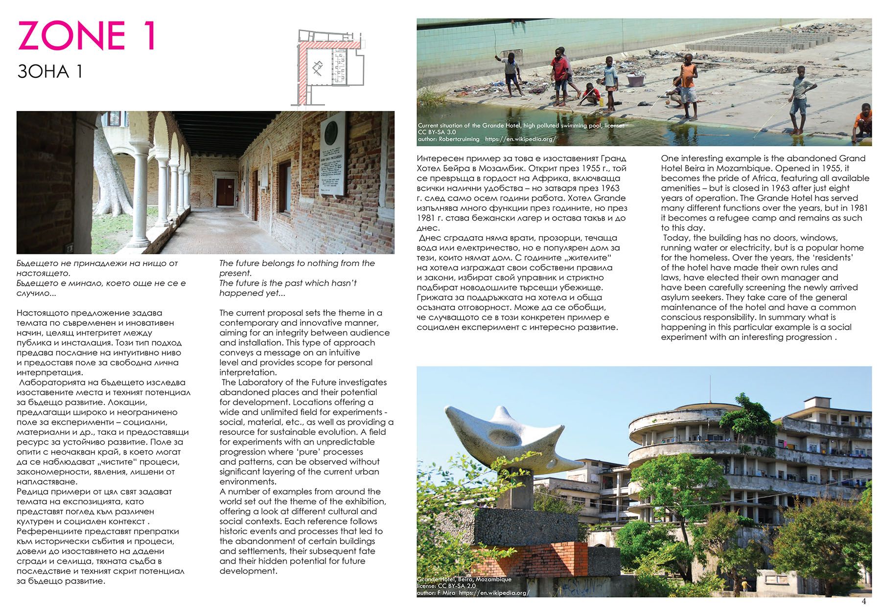 „Училище на бъдещето“ на Ая Тодорова преизползва стари мебели в класна стая, превърната в ретрофутуристка лаборатория. „Ретроспекции в бъдеще време“ на Студио НАДА се занимава с изоставените места като „времеубежища“, по Георги Господинов, и също не дава рецепта за бъдещето, а само очертава път. „Времево разфокусиране“ на „Аедес студио“ работи със „Сляпата Вайша“, пак на Господинов, за да гледа едновременно назад и напред. „Минало бъдеще“ на Studio 8 ½ призовава на изоставените сгради да се погледне като възможност за развитие, а не като бреме. Laboratory of Future (Tomorrow) на Надежда Сучева преоткрива българското село – включително изоставените къщи и обезлюдените места, които могат да имат бъдещ живот.