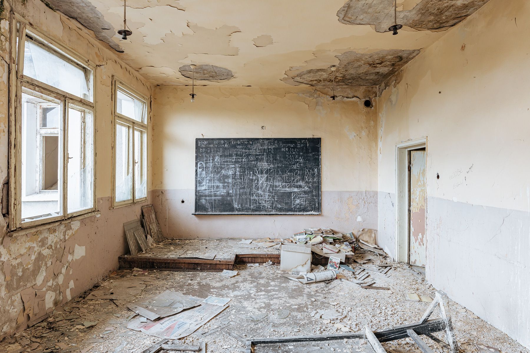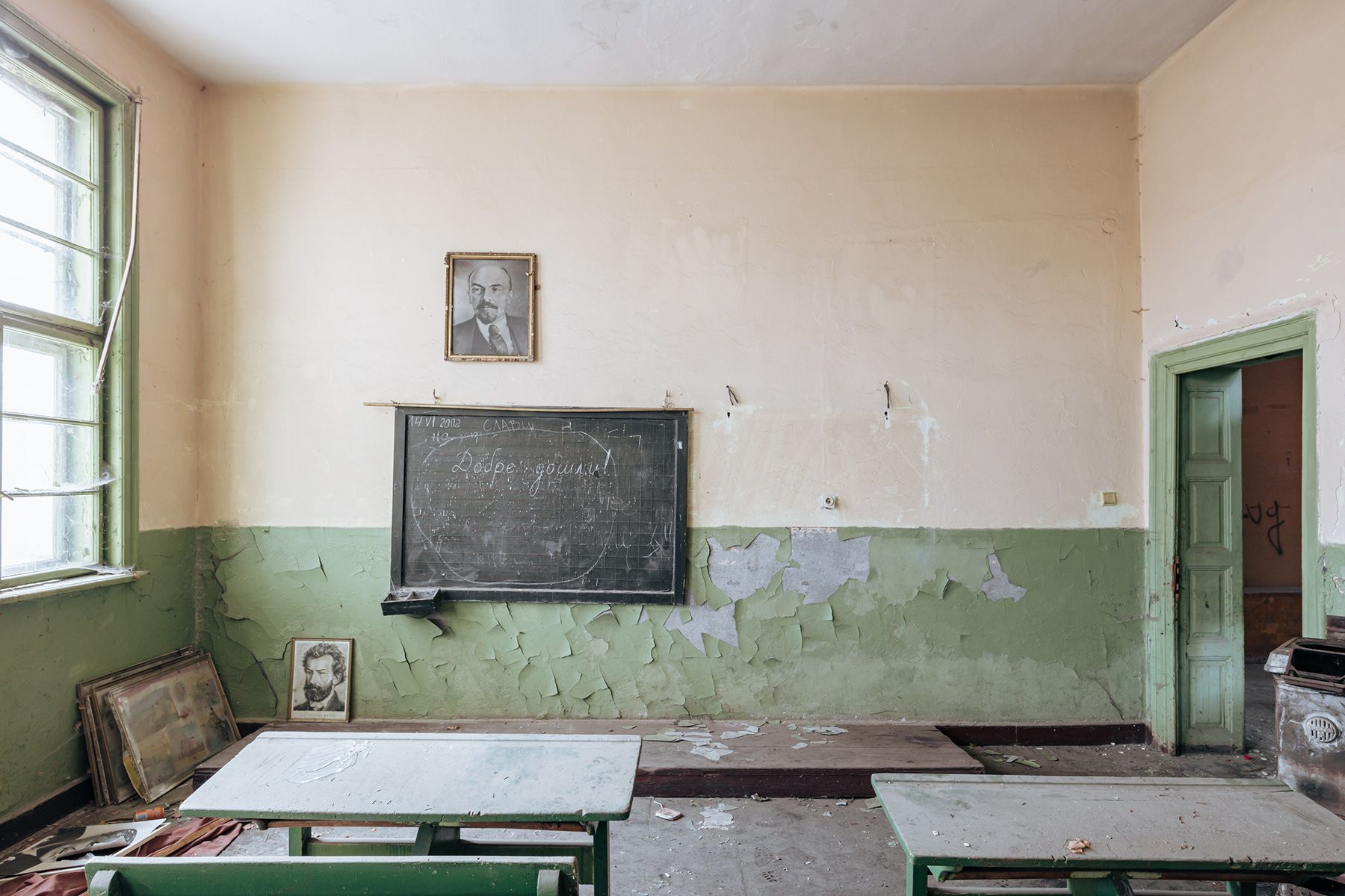 През 2014 г., точно на символната дата 10 ноември, съвсем случайно попаднах в едно изоставено училище. Намираше се в малко село близо до София, в подножието на Средна гора. Подобно на повечето български села, през социализма и това е било снабдено със задължителния комплект обществени сгради и пространства, които се редуваха край река Тополница: площад с читалище, после училище, а малко по-нагоре от тях – кметство с поща. Училището беше голямо, триетажно, но напълно изоставено – по онзи начин, по който хипстъри и урбекс фотографи обожават: с раздут паркет на големи вълнообразни бабуни, с туфи от гъби, прораснали между разместените дъбови паркетини, със старо дървено сметало, облегнато в ъгъла, прашен портрет на Георги Димитров, нахвърляни детски книжки с прекрасни шрифтове и илюстрации и едно „Здравейте“, надраскано с тебешир на зелената дъска.
