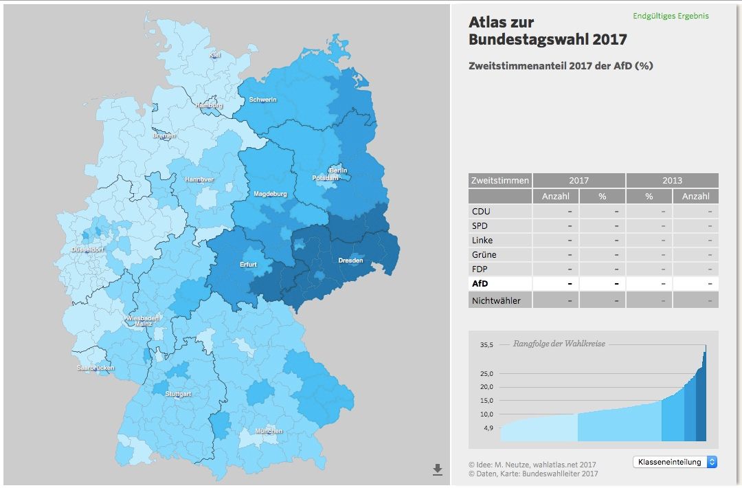 Във Франция работниците също избират Льо Пен, като вероятността избирателите с основно образование да гласуват за крайнодясното е 45%, в сравнение с едва 19% сред висшистите. По-бедните французи също избират Льо Пен. В Германия пък гласувалите за „Алтернатива за Германия“ чертаят карта, която разпознаваме като ГДР и ФРГ отпреди 1989 г. Източна Германия все още настига Запада в много отношения и именно на изток се срещат по-високо ниво на безработица и повече бедност. През 2017 г. БВП на глава от населението в Източна Германия е с 27% по-нисък от този на жител на Западна. Провинцията и селата изостават от ритъма на развитие на големите градове. И в случая с Германия, както в този с Франция, се говори за „периферията“ на големите градове и хората, които живеят в нея, като за изостанали от мълниеносно развиващата се глобализация.