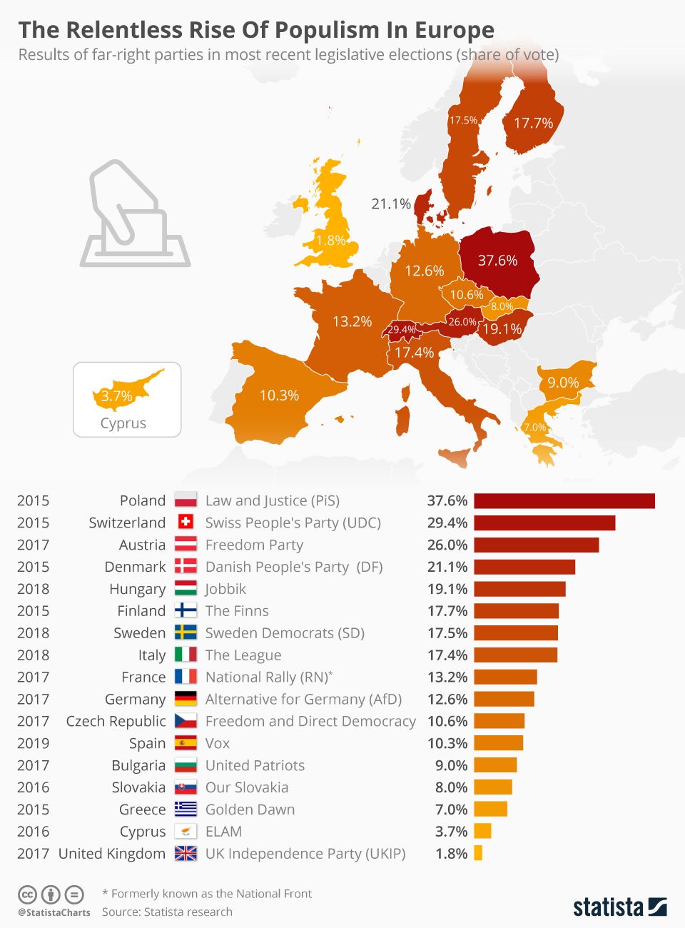 Крайнодесните евроскептични партии в момента имат представителство в 23 от общо 28-те държави членки на ЕС. Единствените държави в Съюза, които нямат крайнодесни сили в националните парламенти, са Ирландия, Малта, Португалия, Румъния и Хърватия, сочи Statista. Най-голям дял от вота крайнодясното печели в Полша, където „Право и справедливост“ води с 37,6% на последните парламентарни избори, проведени през 2015 г. Най-слабо се представя британското крайнодясно с едва 1,8% резултат на изборите през 2017 г.