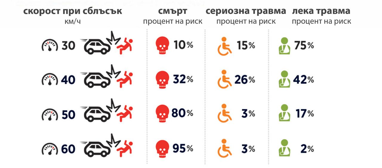 Ограничаването на скоростта в оживените градски части е основен подход, с който се намаляват смъртните случаи и травматизмът при ПТП между автомобил и пешеходец. Това е причината в много европейски градове да се прилага т.нар. „Зона 30“ в централни и жилищни райони. Но освен поставянето на знаци за ограничение на скоростта до 30 км/ч, в тези зони се изпълняват и физически мерки, с които се гарантира, че средата не позволява на шофьорите да развият по-висока скорост. Виена, която често се сравнява по размери и план със София, е въвела „Зона 30“ на територията на почти целия град. Прилагането ѝ започва още в края на 80-те години на миналия век, като този подход се смята за много успешен в жилищни райони и на второстепенни улици. От началото на 2021 г. същият подход бе предприет и в Брюксел, където „Зона 30“ покрива всички улици, с изключение на големите градски булеварди, както и жилищните квартали, където ограничението вече е 20 км/ч.