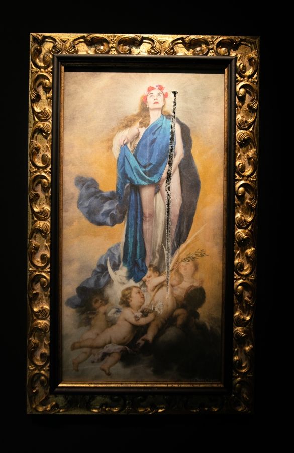 Раздраната жена е в „С цветя за Мария“ на Чаро Коралес, която – дали с голите си крака, дали с дланта между тях, дали с факта, че художничката си е направила автопортрет в синия плащ на Богородица – дотолкова засяга чувствата на млад испанец, че той влиза в залата, където е изложена картината, и я разпорва.
