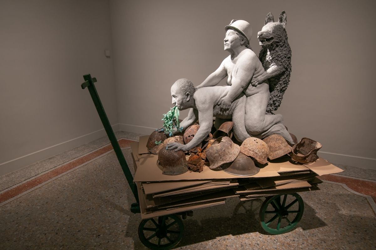 Впрочем именно „Животното и владетелят“ (по Дерида) е надсловът на изложбата в барселонския MACBA, от която преди няколко години спешно е изключена Not Dressed for Conquering/Haute Couture 04 Transport на австрийката Инес Дуяк – скулптурна група от папиемаше, в която радостен вълк обладава боливийска синдикалистка, която на свой ред обладава бившия крал на Испания Хуан Карлос I, повръщащ зелена растителност върху германски каски. Докато вилнеенето над безкрайно компрометирания монарх ми е някак разбираемо, това над смелата Домитила Чунгара, изтезавана за възгледите си и починала от рак, ме обърква и се налага да търся информация извън музея (едно от големите му предимства – дава хляб за размисъл и отваря апетит за още).