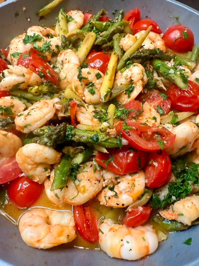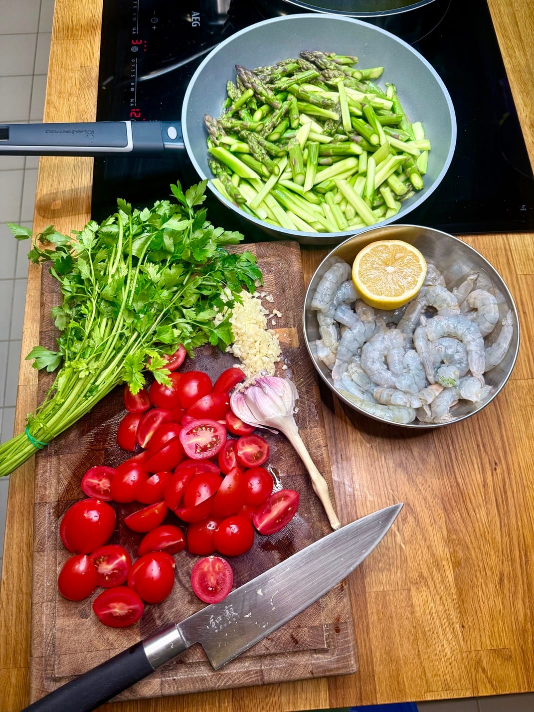 След 5 минути към тях се добавят 300–400 г обелени сурови скариди, три скилидки нарязан чесън, всичко се подправя със сол и черен пипер и се разбърква. След още 3 минути в тигана се добавя една шепа разполовени чери домати, полива се със сока от половин лимон и се поръсва с една връзка нарязан магданоз.