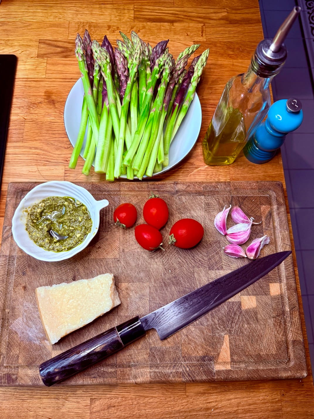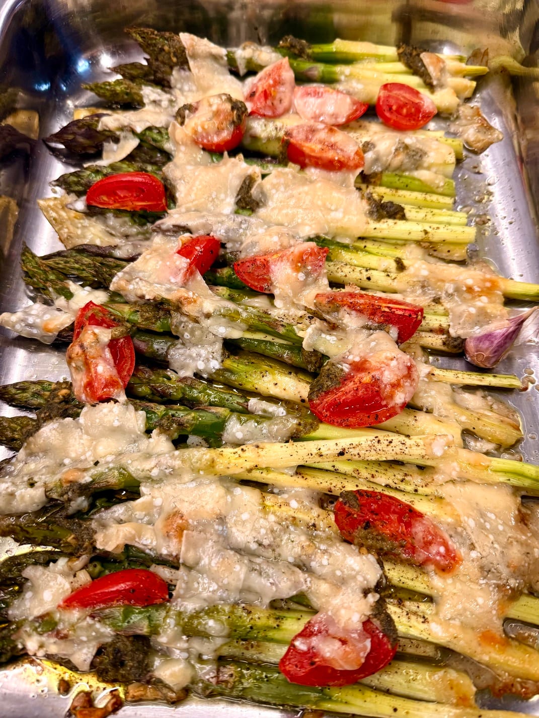 Аспержите с чесъна се посоляват и се поръсват щедро с люспи от пармезан (или друго твърдо сирене), две супени лъжици песто дженовезе, разпределени по повърхността, и две шепи разполовени чери доматчета.