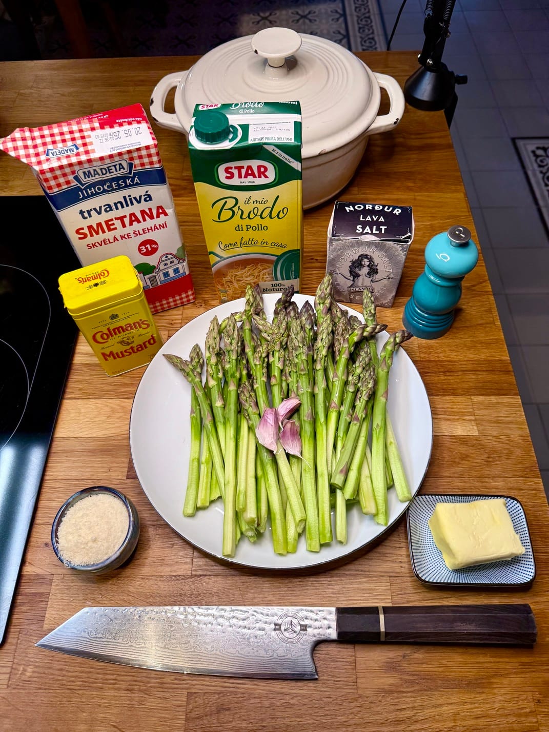 Нарязаните аспержи заедно с две скилидки чесън се варят в 1–1,5 л зеленчуков или пилешки бульон до омекване, а след това сместа се пасира добре и се маха от котлонa.