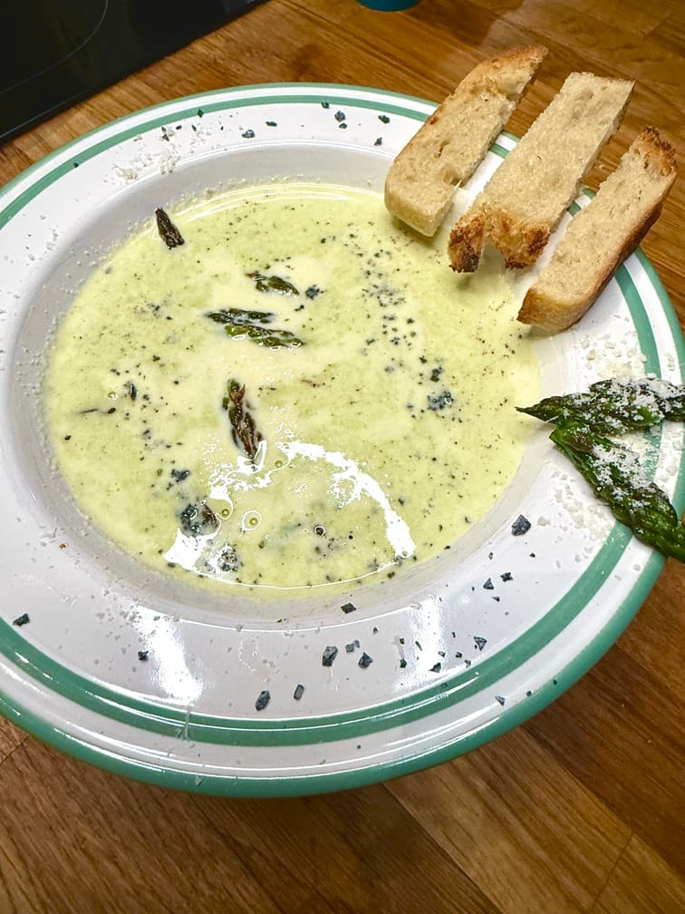 При сервиране супата се поръсва с хрупкавите връхчета на аспержите вместо крутони и с настърган пармезан. Върви също с препечена филийка.
